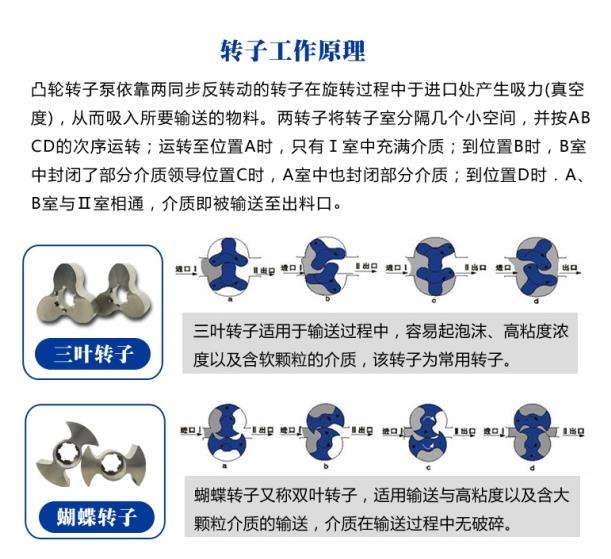 轉子泵采用的二葉、三葉、碟形、多葉型的轉子,是一種多用途的容積式輸送泵。它具有轉速低、輸出扭矩高、耐高溫、耐腐蝕等特點,是一種衛(wèi)生型的容積式輸送泵。其獨特的工作原理和特點體現(xiàn)在輸送高粘度、高溫度、高腐蝕性的物料中,其輸送過程平穩(wěn)、連續(xù),并且能夠保證物料在輸送過程中物理性能不被破壞,可輸送物料的粘度,可高達1,000,000CP。