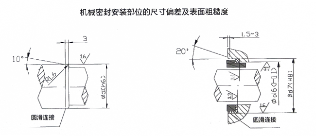 1、與機(jī)械密封所配軸和靜環(huán)座的尺寸公差、表面粗糙度和倒角過渡形狀見下圖;